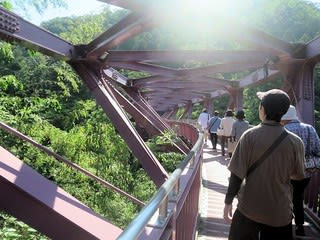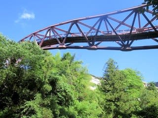 デザインの「あやとり橋」を渡り、渓谷沿いの「鶴仙溪」